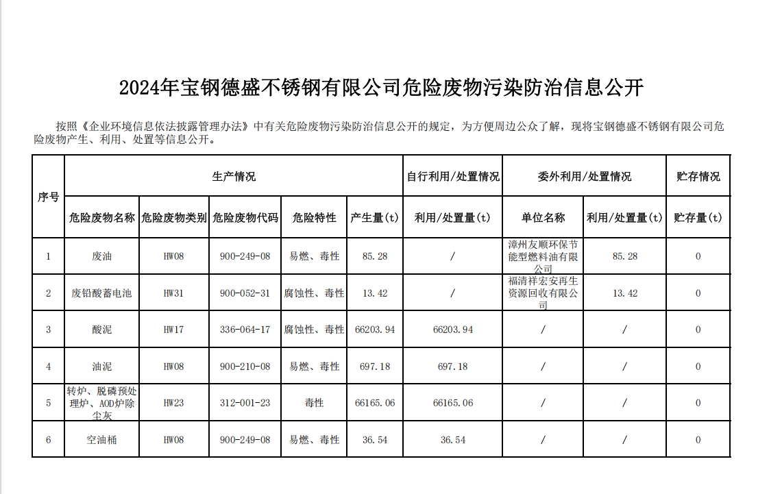 2024年寶鋼德盛不銹鋼有限公司危險廢物污染防治信息公開